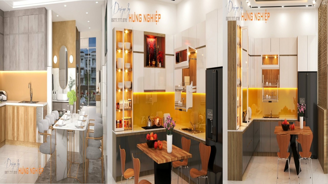 Phòng bếp thông thoáng với hệ thống cửa chính, cửa sổ nối ra sân vườn. Nội thất hiện đại với chiếc tủ nhiều ngăn được sơn trắng kết hợp với màu xanh lá, tiện nghi trong việc cất giữ đồ đạc nấu nướng. Chiếc bàn ăn xinh xắn kiểu dáng độc đáo được đặt ngay ngắn tại đó. Một không gian ăn uống đủ đầy, thú vị.